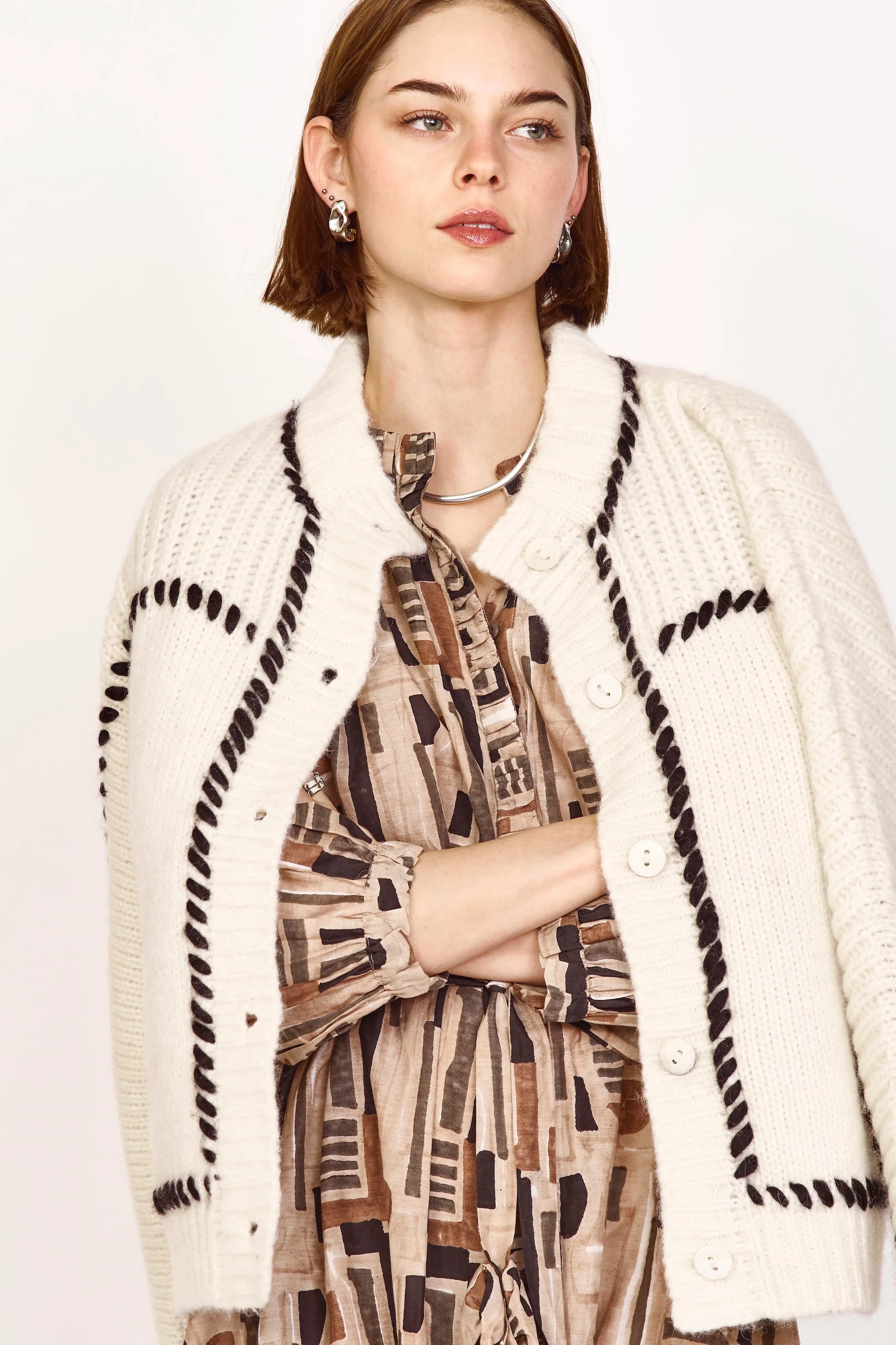 • Heavier weight winter cardigan with contrast hand embroidered whipstitch