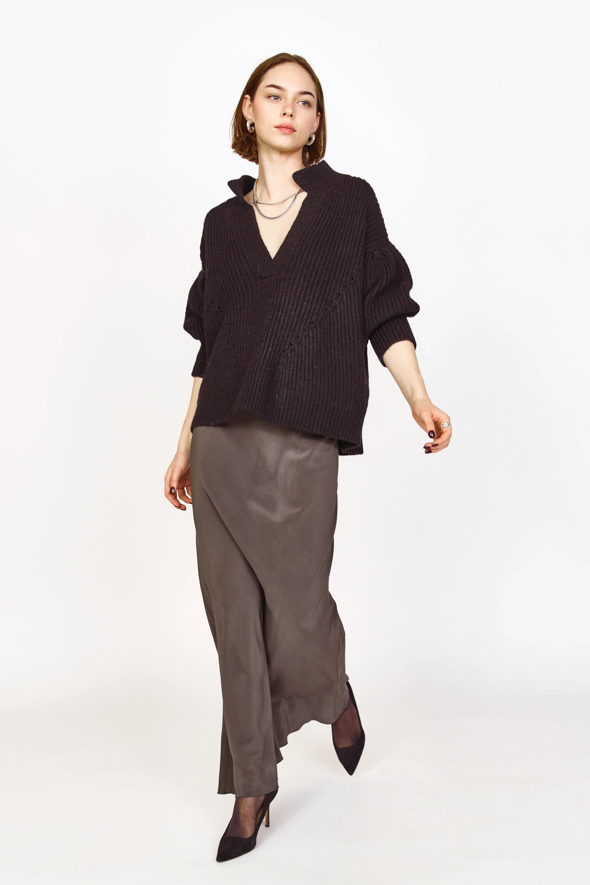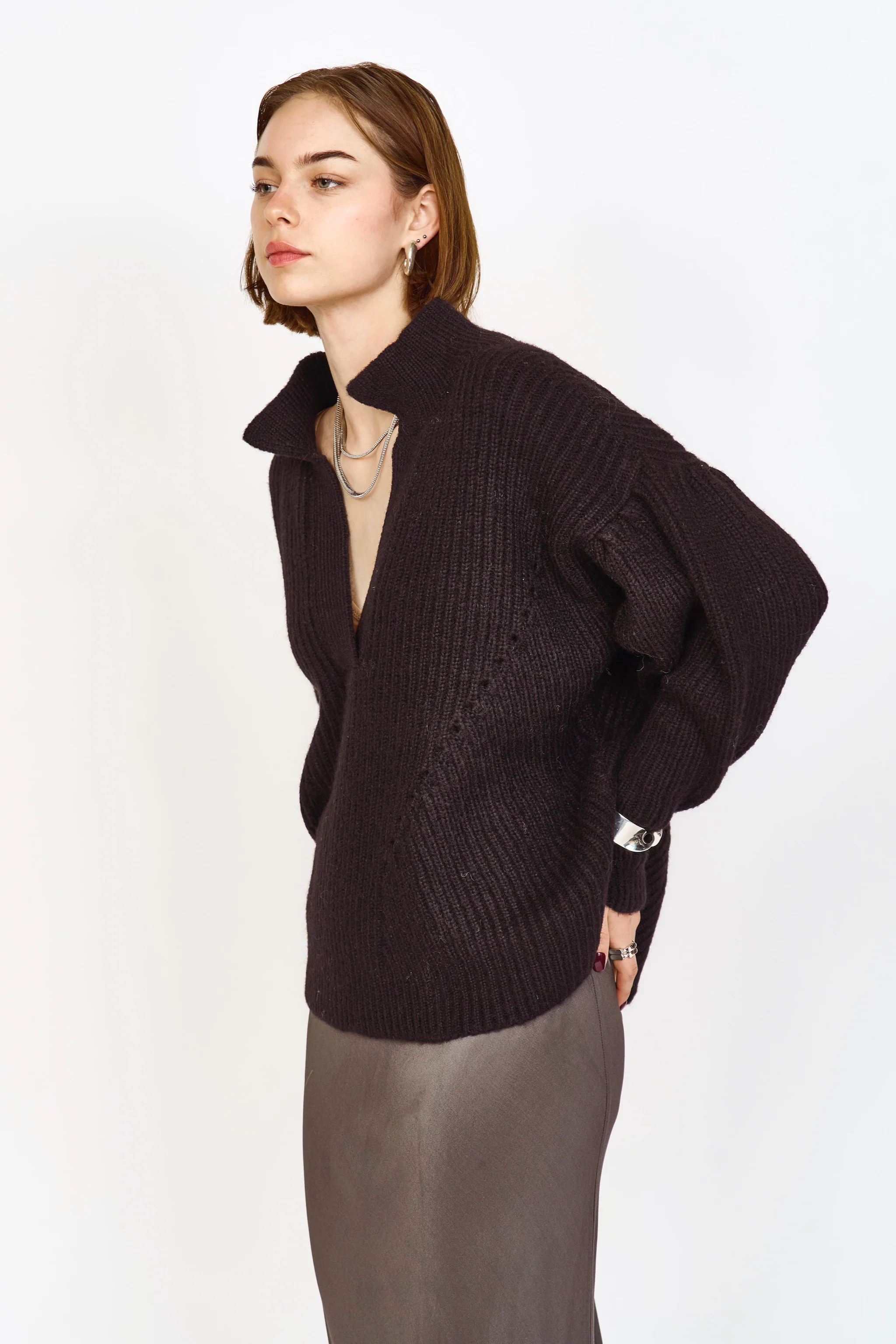 - Mid weight pullover sweater with deep neckline and collar