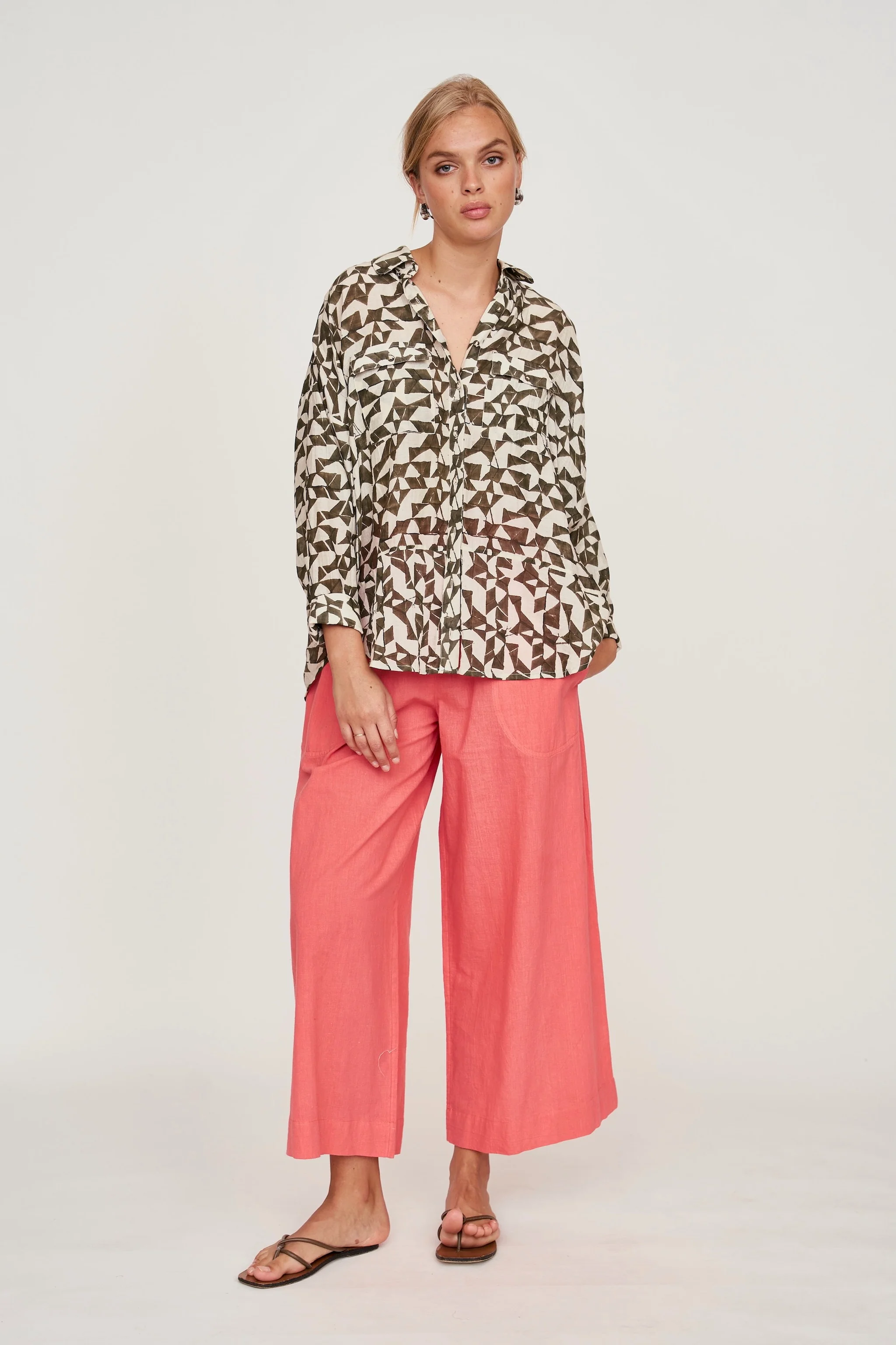 - Oversized blouse with front button placket