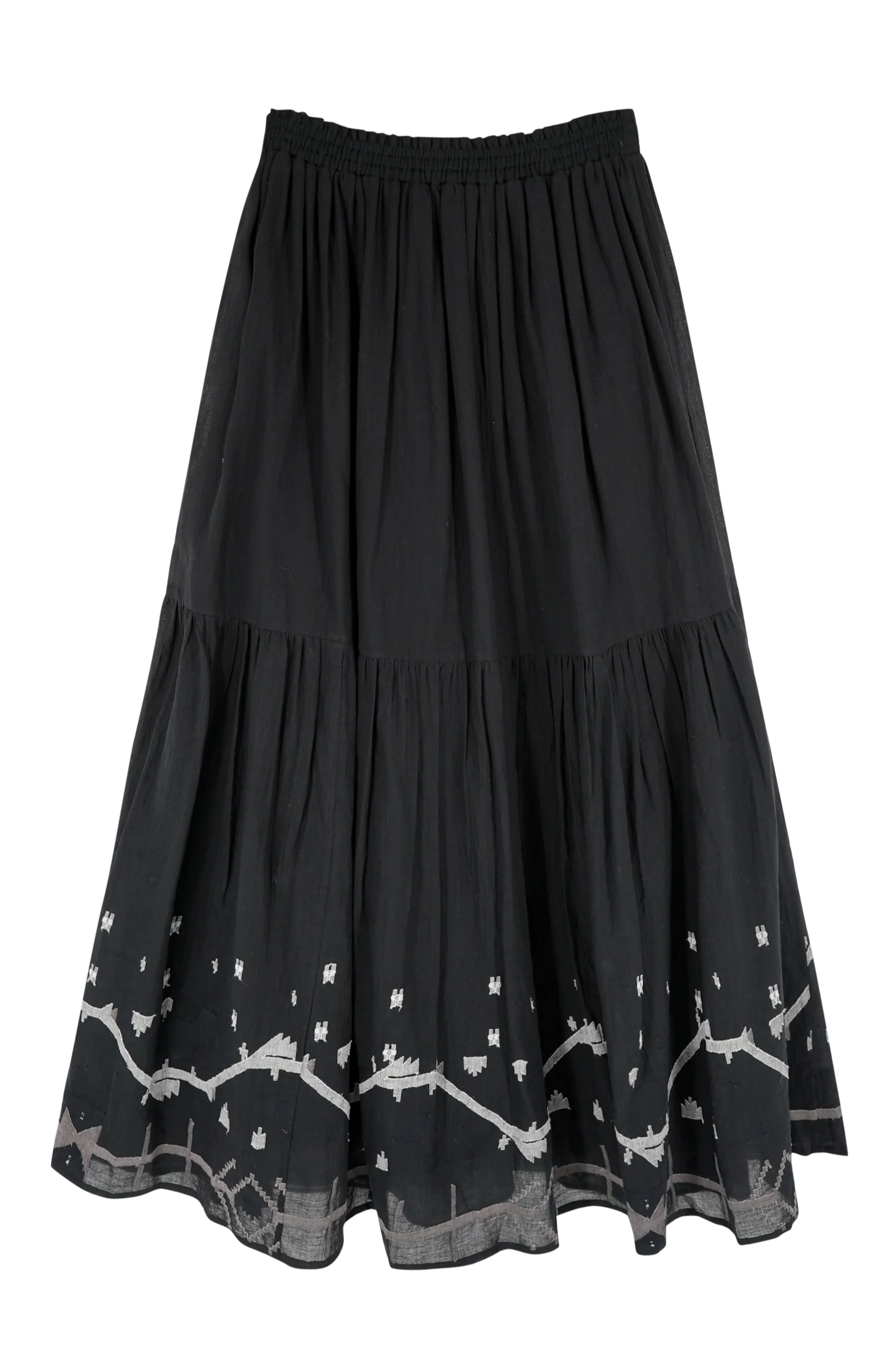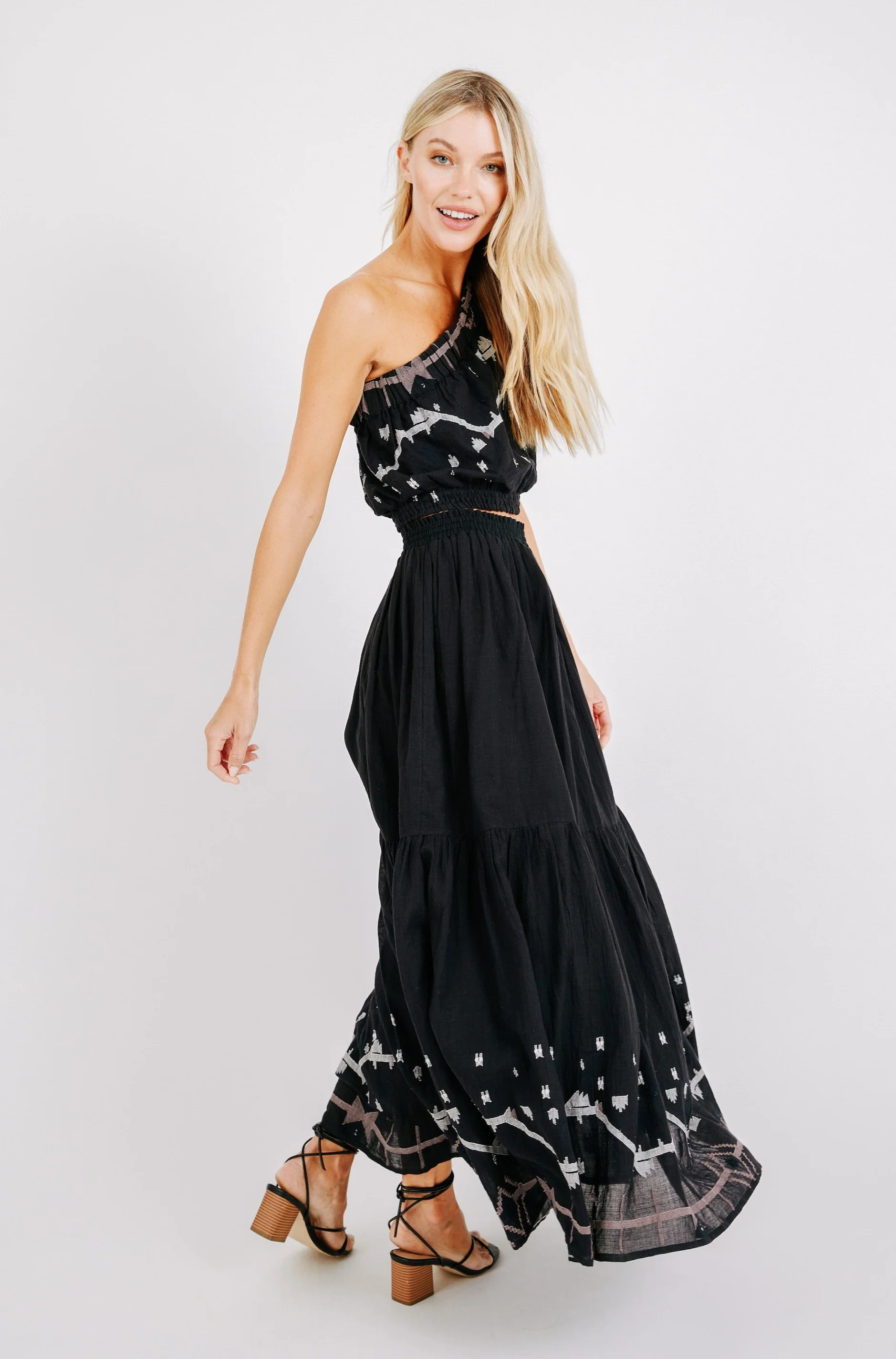 melding indian textiles and spanish design, this set is a statement that’s as comfortable as it is striking. the incredibly soft fabric in the skirt is lined in 100% cotton and features an intricate jamdani motif along the hem. pairs with our cropped paros one shoulder top, hudson tank or and somerset top for more coverage. we alos love it with a slim black tank.